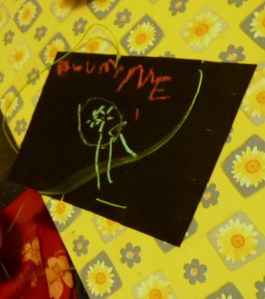 Primero dibujan sobre una cartulina naranja algunas arañas y el nombre del destinatario de la tarjeta. Yo también lo hice con cartulina negra dibujada con crayones o tizas claras (también se puede usar corrector blanco para pintarla pero tiene que haber un grande cuidando).