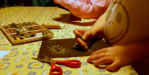 Finalmente con un hilo de color contrastante (para tarjetas naranjas el negro es perfecto, para las tarjetas negras puede ser amarillo o naranja o verde claro) van dándole vueltas a la tarjeta, enganchando el hilo en los cortes del papel. Esta es la parte más divertida para ellos y probablemente quieran seguir haciéndolo aunque tapen todo. Mi sugerencia es dejarlos hacerlo como ellos quieran y tratar de intervenir lo mínimo indispensable. Tal vez la primera puede ser de prueba y luego conversando sobre los resultados puedan volver a hacer otras más.