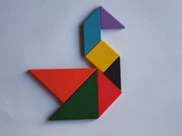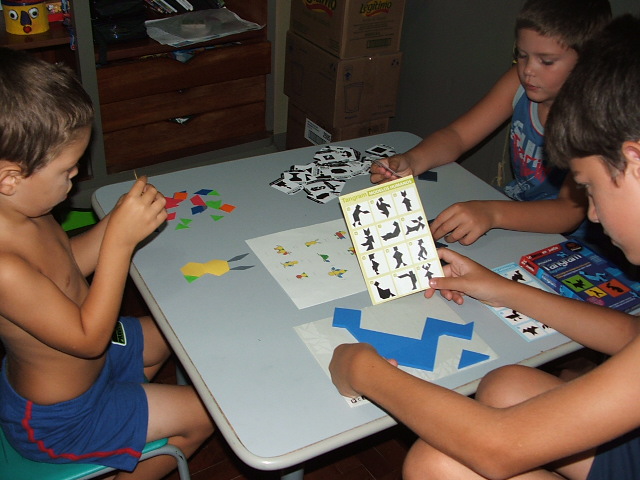 El Tangram es un juego chino muy antiguo que se asemeja a un rompecabezas. Son 7 piezas que se usan para formar siluetas de animales, cosas, personas, etc. Nosotros teníamos dos Tangram en casa con los cuales jugaron Agus y Maxi (10 y 7 años) y para Franco (5 años) prepare uno especial para su edad que imprimí de la sig. página: http://prekinders.com/pattern-blocks/