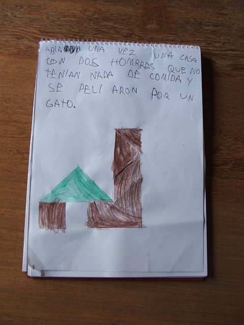 Hicimos un par de actividades más jugando con el Tangran. Hicimos formas en tangram con papel glase y papel blanco, que después coloreaban y tenían que inventar un cuentito con esos personajes o cosas.
