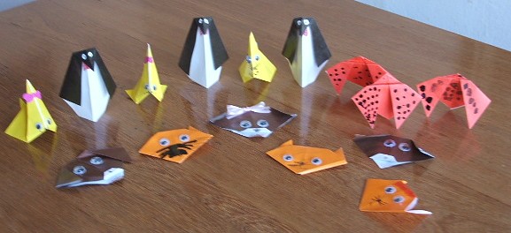 Les cuento que Augusto (de 10 años) hizo un taller de origami y sabe hacer unas cosas hermosas pero un poco difíciles para que los puedan seguir sus hermanos de 7 y 5 años. Por ello hicimos figuras súper simples en papel glasé como: el pingüino, el conejo, el perro, el gato y la vaquita de san Antonio (o “mariquitas” como le llaman los chicos) que sacamos de la sig. página: http://www.origami-fun.com/origami-for-kids.html .