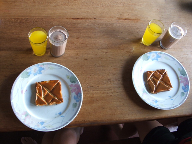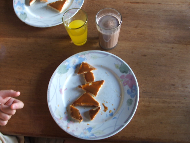 Y después hicimos una merienda muy especial, preparé unas tostadas con dulce de leche cortadas con la forma del Tangram y ellos tenían que realizar una figura antes de poder comerle las partes. Fue muy divertido.