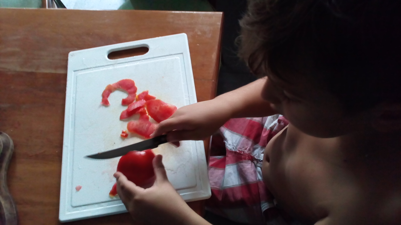 A ver, no es que antes de ayer yo defendiera la tarea escolar. En absoluto creo que sirva de mucho, si es que sirve de algo. ¡No me gusta que les manden tarea escolar a casa, detesto la tarea y hasta a veces me enoja cuando es extrema! (tengo reacciones emocionales tan parecidas a las de mis hijos!). No es que antes me gustara la tarea. Es solo que por haber leído esta reflexión, tan simple y a la vez tan cierta, tenía muy presente que en vez de que mi peque se quedara mirando netflix mientras yo hacía «mis tareas» podíamos pelar juntos los tomates de la cena. Nada, nada, nada de todo lo importante y profundo que charlamos escapó a ese momento de encuentro. El resto del día se resumió en conversar sobre cosas prácticas y jugar a armar un dominó alemán como una pista de autos con la dificultad de asociar colores, lateralidad y correspondencia. Un día que tuvo en casa lo que tiene que tener: encuentro, escucha, risa y APRENDIZAJE ESPONTÁNEO Y LIBRE. Pero de eso no hablamos. No. Solo hablamos de lo linda que es su maestra y de lo entusiasmado que está por volver a la escuela.