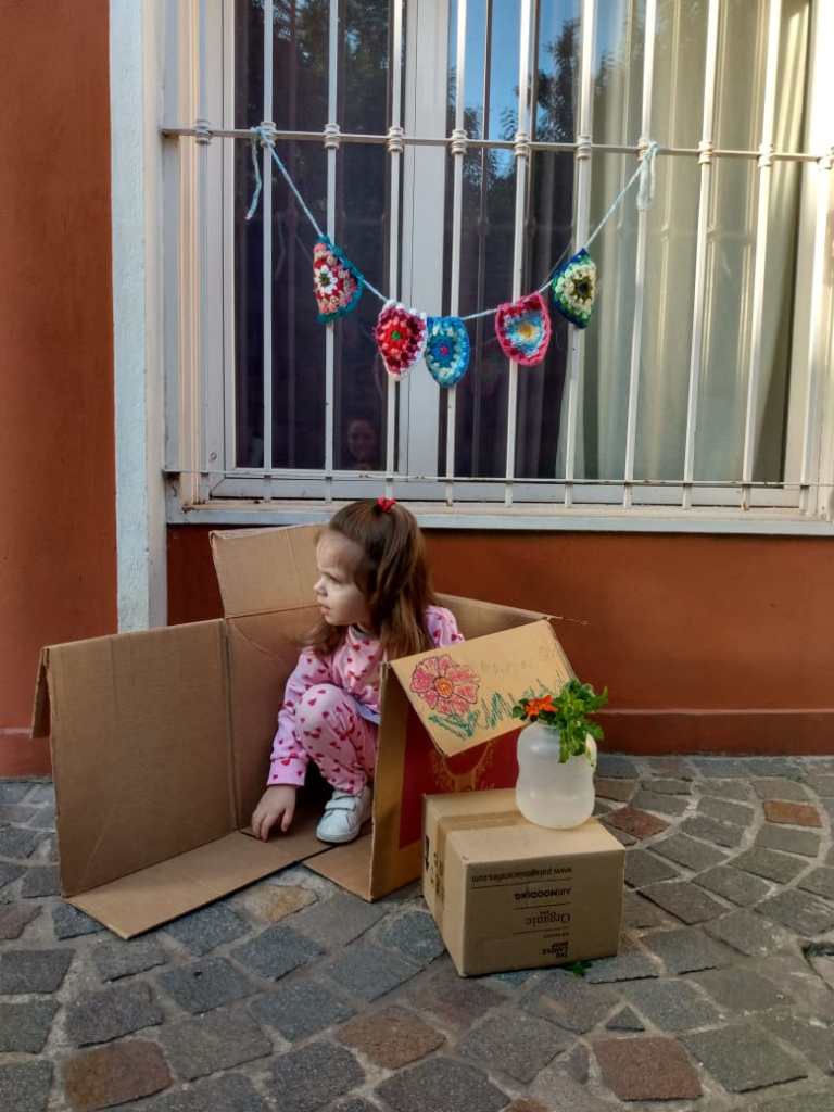 Y así, con una caja grande, dos crayones, una guirnalda de banderines, un tarro y un ramillete verde y naranja generosamente donado por la bignonia del jardín se armó el primer quiosco de flores en el fondo de la casa naranja.